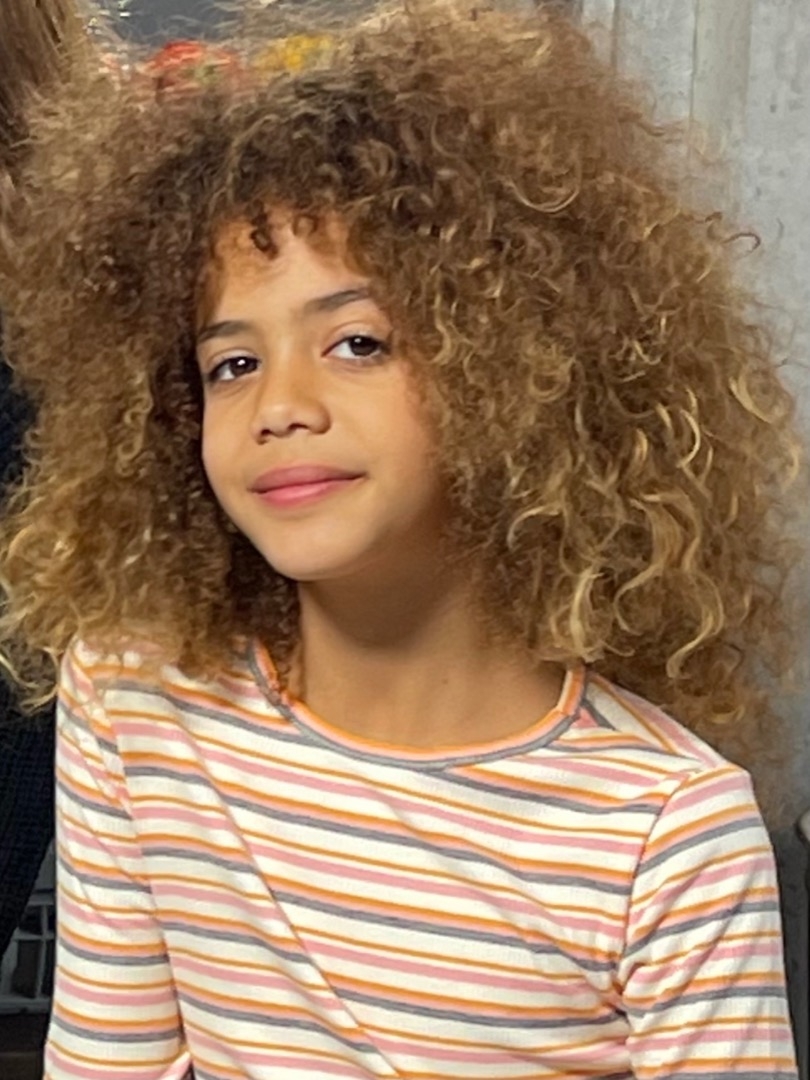 בת 9 לומדת משחק ניסיון מול מצלמה שיער אפרו מתולתל מנופח